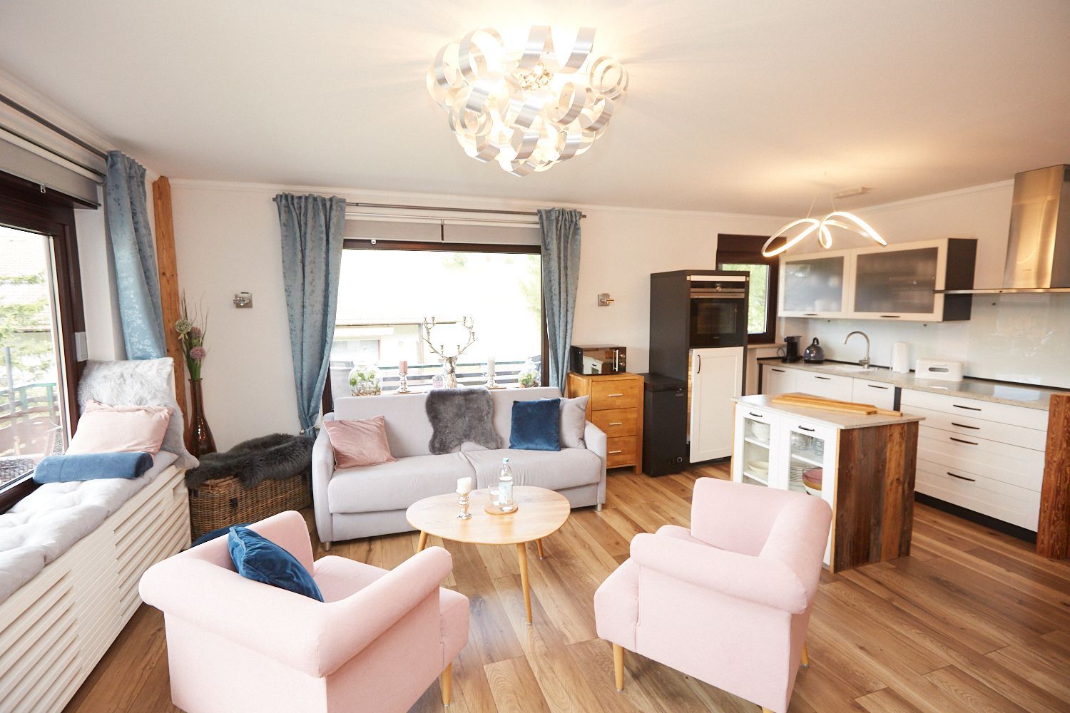 Der Wohnraum ist mit einer offenen Küche und Kücheninsel ausgestattet. Esszimmerplatz für 4 Personen, sowie Schlafsofa und Sessel zur Entspannung vorhanden. Das Schlafzimmer ist mit einem hochwertigen Boxspringbett ausgestattet.
